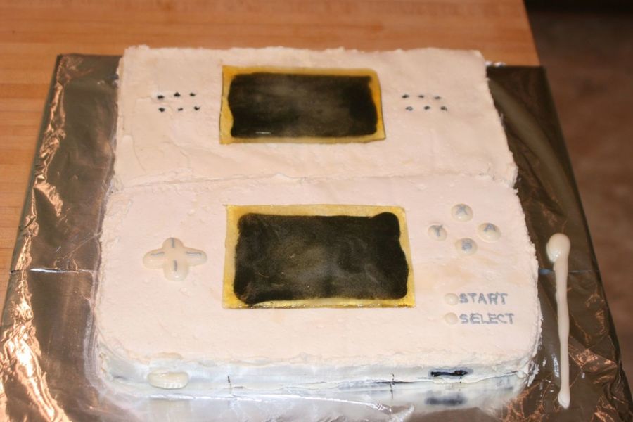 Buttercream frosting. I made screen from crushed and melted rock candy. Black gel frosting underneath! Happy 11th bday to my little guy ;)