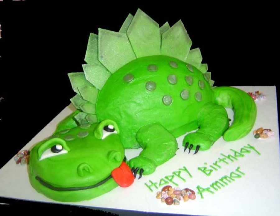 This cake was totally inspired by Rainamehta's red dinosaur cake with a few little added twists of my own. It is frosted with buttercream. The disks on it's back is MMF mixed with gumpaste.