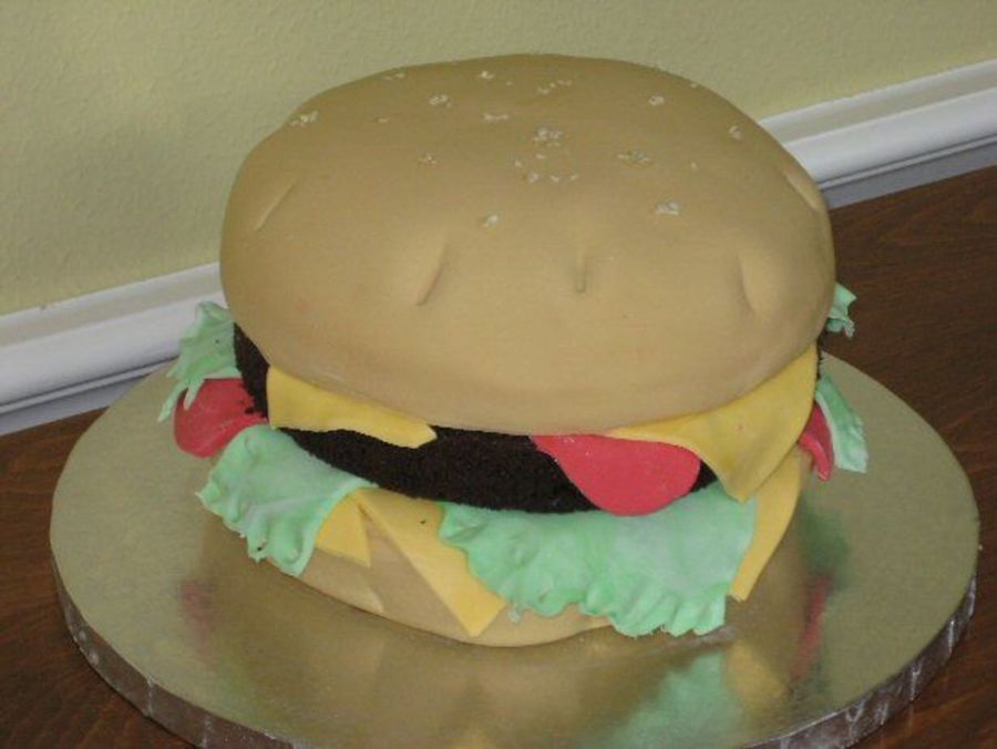 Made for my son's 14th birthday. Yellow cake as burger and chocolate layer for burger. Covered in fondant with fondant cheese, lettuce and tomato. It was such fun to make.
