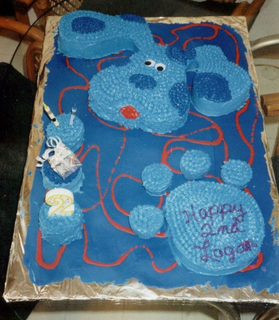 I made this Blues Clues Cake freehand, for my littlest grandsons 2nd birthday. I didn't have a pattern, so I just cut the pieces from pound cake, then I colored & melted the frosting (Duncan Hines Vanilla) and poured it over the cake & background. The 3 little cakes are Blues clues.