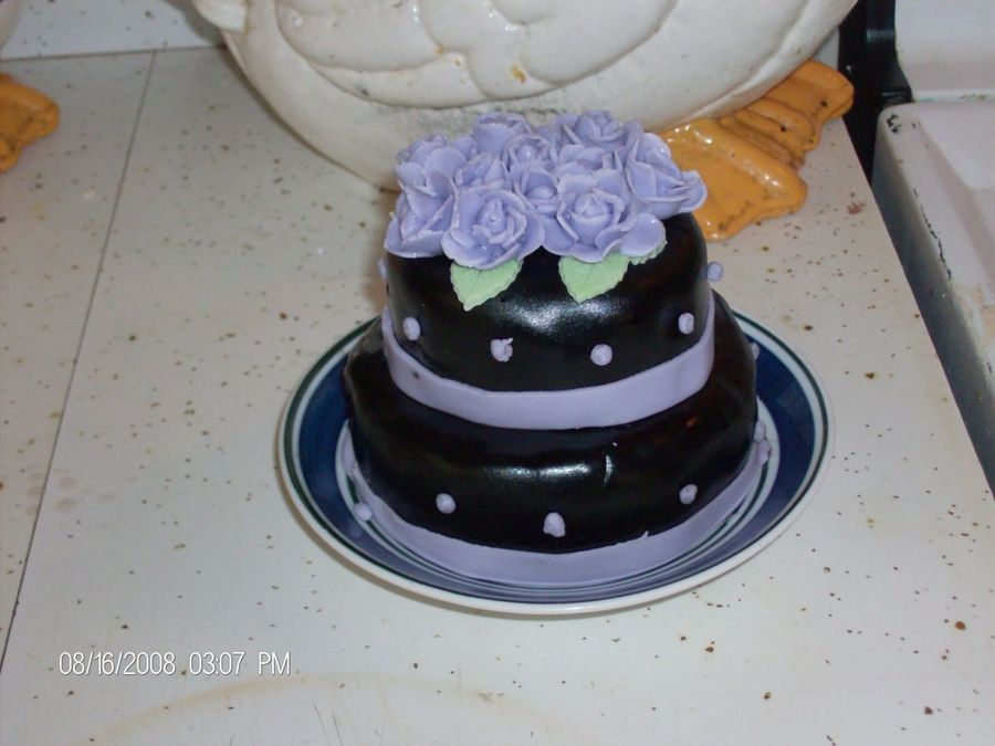 My first cake, A mini wedding cake, two layers. I was in a hurry to do it so the ribbon lining came out crooked. All in all it came out great. I used fondant and just airbrushed the black on. I made the roses and leaves from gumpaste. The inside is chocolate and chocolate filling. The recipes were used from wilton.