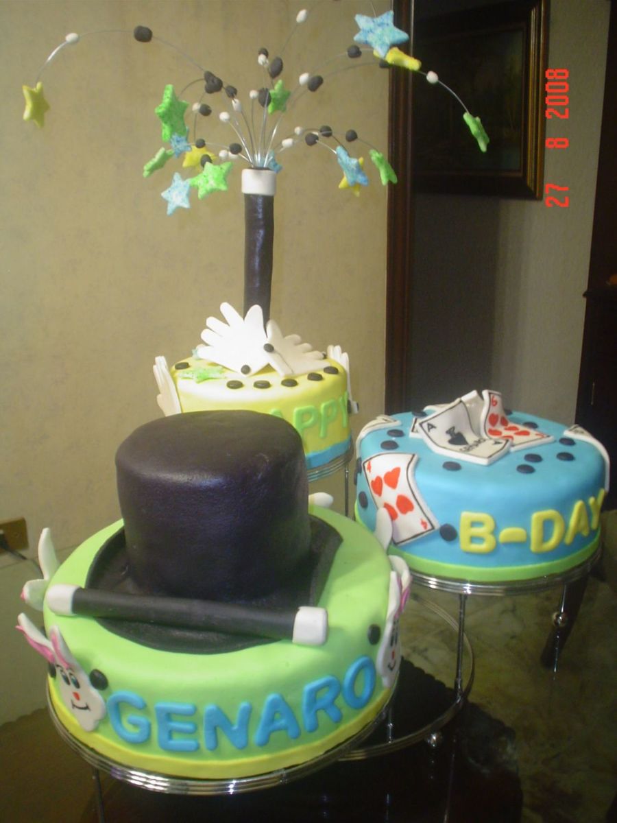 Hice este pastel para mi sobrino..el queria que su pastel tuviera conejos, la varita magica, los guantes de mago, barajas y estrellas y por supuesto no puede faltar el sombrero de mago..su deseo fue cumplido... en sus 6 años.