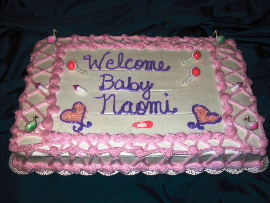 This 11x15 coconut vanilla cake was iced in buttercream with latice work and reverse shell borders and accented with plastic baby items.