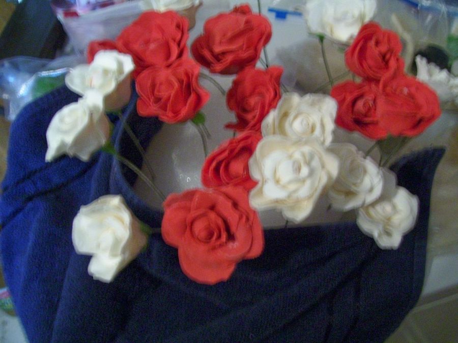 Rose and white gumpaste roses made for a friend who was ill to help cheer her up. There were arranged in floral foam and a cobalt blue vase, but of course I forgot to take a picture then!