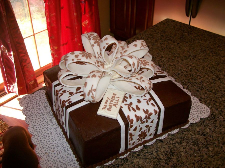 Inspired by the new wilton year book. It was a wedding cake but I only did one teir and made it a birthday cake. This is my first time using fondant. I used michele foster's recipe(I love it!). Also the first time I've done a square cake. I know it's not perfect, but I like it. It's a chocolate cake with vanilla filling, chocolate buttercream with fondant accents.
