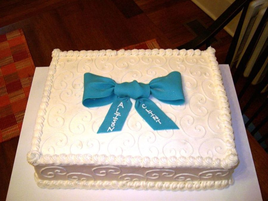 An 11x18 sheetcake with Earlene's shelf stable cream cheese icing (tastes nothing like regular cream cheese icing). The bow is MMF. I sprinkled silver edible glitter on top. The scrolls are done using the Wilton press since I cannot free hand very well.
