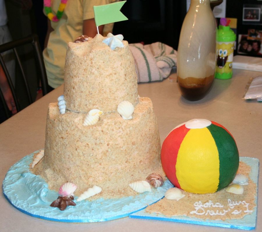 I made this cake for my nephew's 1st birthday. They did a luau theme. Each tier has three cakes stacked. I carved into the top cake of each tier to give some dimension. Used BC frosting and crumbled vanilla wafers for the sand. The wafers added a nice flavor to the BC frosting. The flag is gumpaste, and the shells are chocolate. The beach ball is made using a ball pan and covered in BC. It was used as the "smash" cake. The board was covered in blue royal icing.