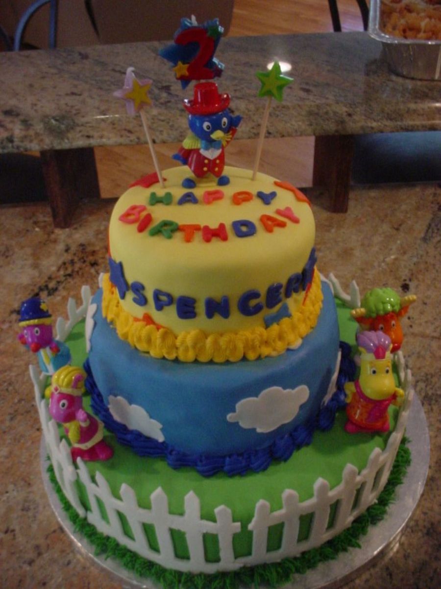 This is a cake for my son's 2nd bday party. 12", 8" and 6"-- a yellow, marble and fudge w/ buttercream filling. I loved how it turned out but was very dissapointed in the picket fence. Otherwise everyone just loved it.