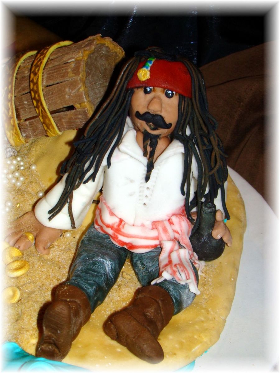 This was part of a small collage(Jack Sparrow on the beach w/his treasure and Davy Jones's heart) that didn't fit on the cake board so it ended up on its own board as a seperate decoration and they loved it. Everything is edible, gumpaste, fondant, RI, edible jewels,sugar pearls, RI gold coins.Jack doesn't look so great but it was the best I could do, he is all gumpaste/fondant. Looks like he had a little too much Rum......