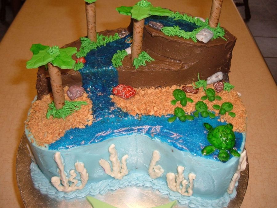 Client wanted sea turtle w/ babies going to the see. Iced w/ bc, fondant accents, coral is chocolate.