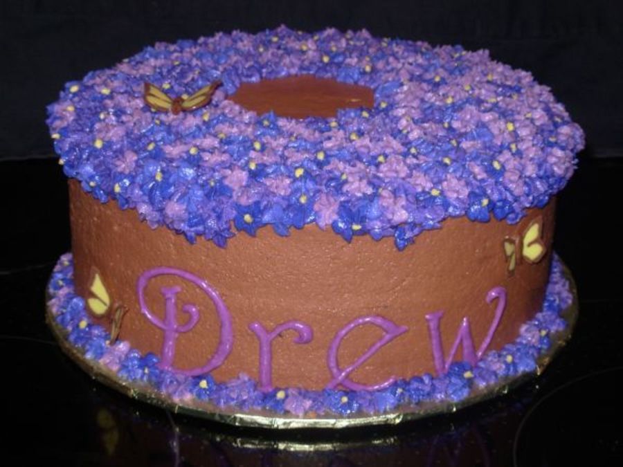 Lots of purple drop flowers in varying shades. All buttercream. Name and butterflies in chocolate. They were putting a unicorn topper on, so I left the center open.