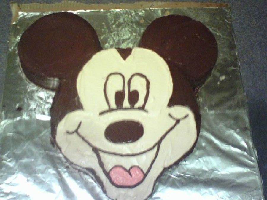 M-I-C-K-E-Y mouse cake ears were made out of 6 in round pan and face made form 10 in and carved out some what.. ears were white cake and face was choc. all bc incing..... thanks for lookin