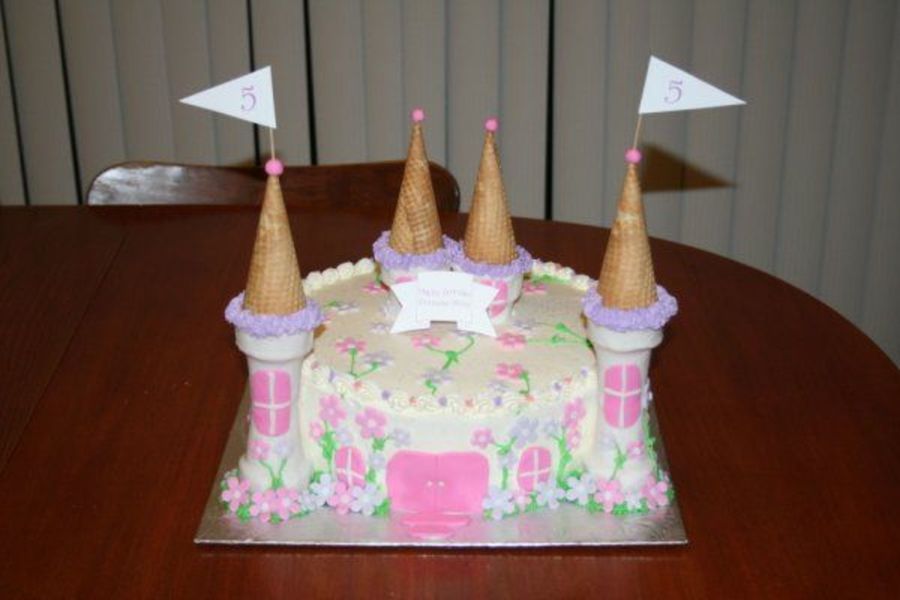 I got this idea off of the CM site. The cake is decorated in BC with fondant accents. Turretts are icecream cones covered in fondant and glued together with royal icing.