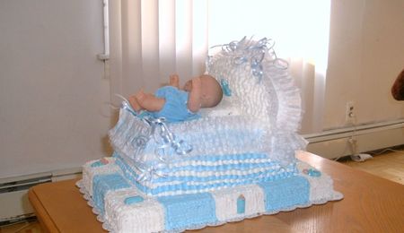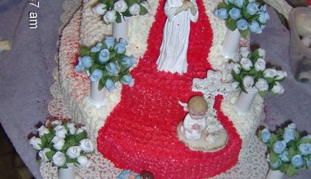 all b c frosting candy crosses ths cake is alot bigger then ut looks in the picture i used wirton cross pan it the bottom is 2 -14 by 20 inch oval pan i also added silver pearls on the cross just to gice it alittle more detail i had fun making this cake thanks for looking