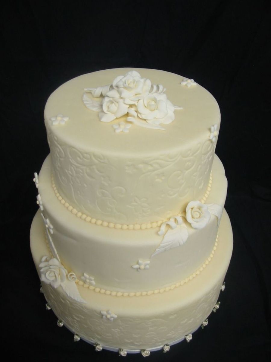 Cake dummy made for local hotel's mock wedding I recently attended. All I was told was that the colors were ivory & blue. This is the first cake where I rolled out the fondant not having a design in mind! I just went with the flow! I used Wilton's new impression mats (didn't really like working with that!). Fondant/gumpaste flowers. I hope I attracted some brides with this cake! TFL!