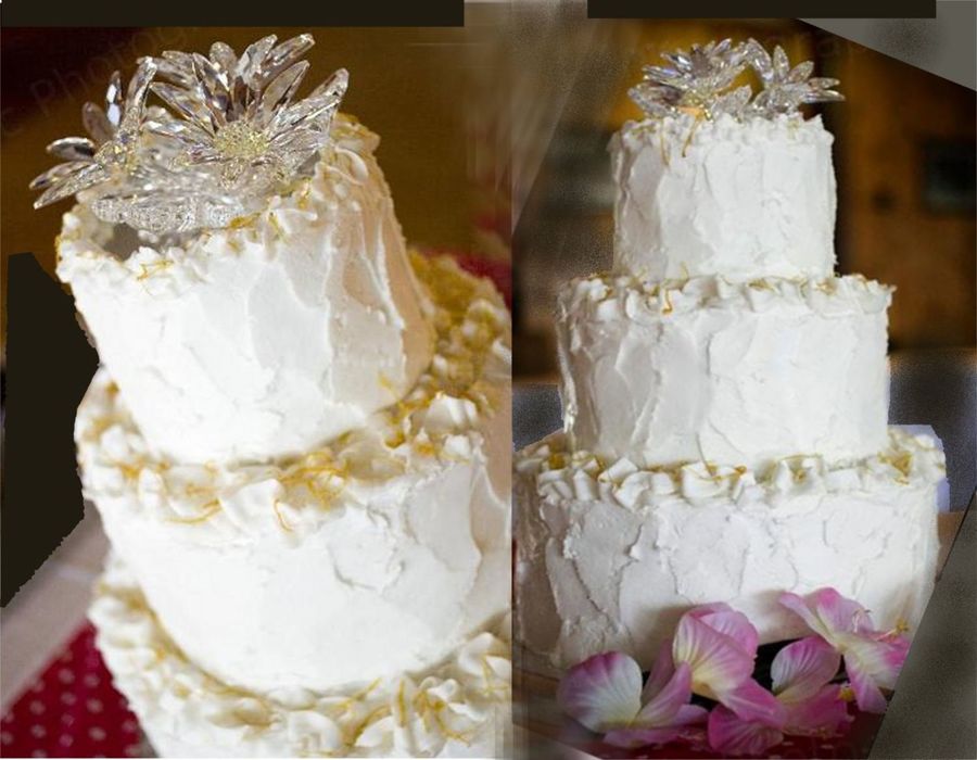 Roughly frosted with buttercream and accented with lemon zest curls topped with crystal flowers placed on mirror.