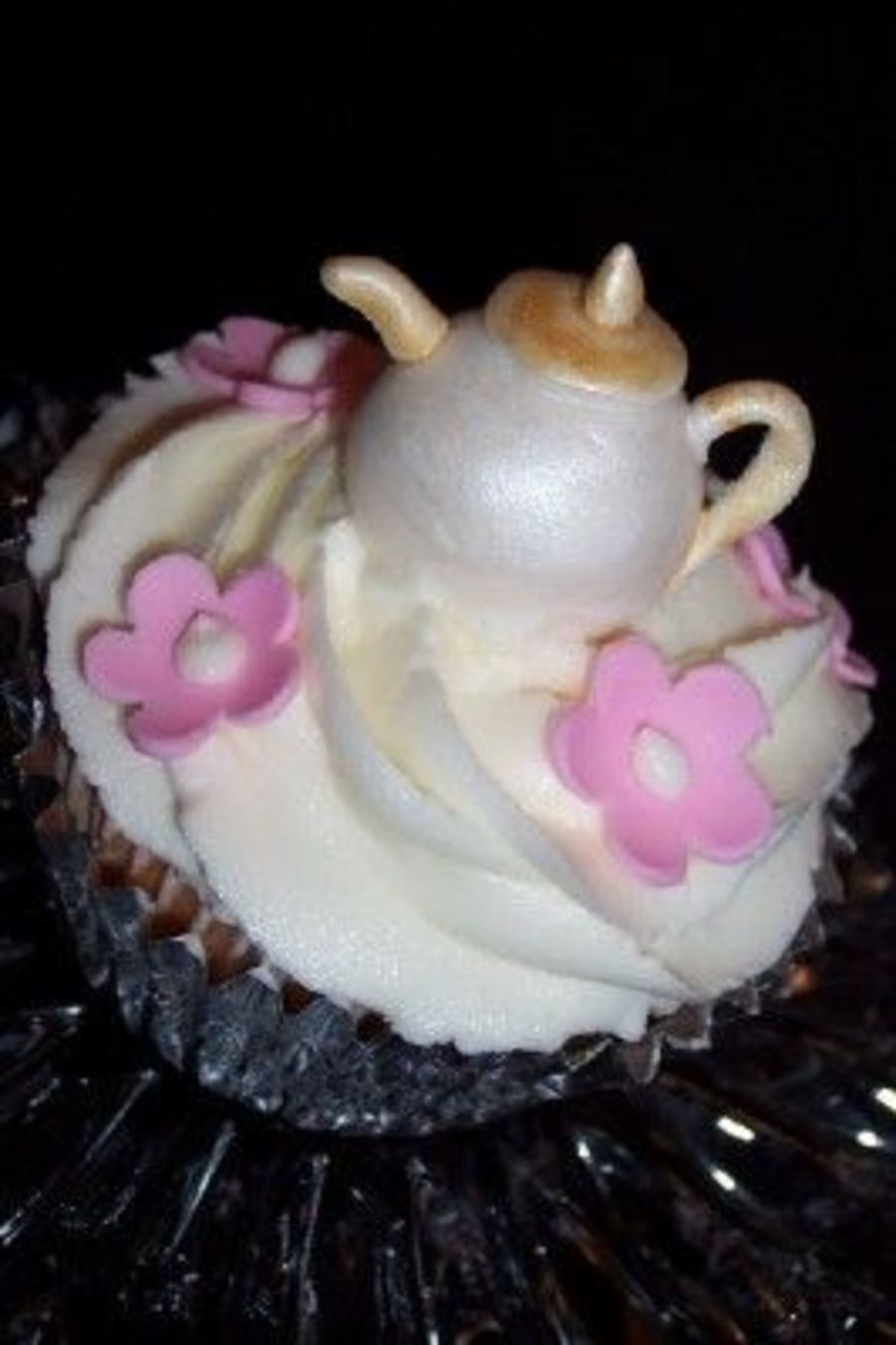 Orange creamsicle Cupcakes with Orange Creamsicle Filling and Orange Buttercream. Fondant flowers and teapots!! Fun to make, fairly easy when using my time well. Didn't get a chance to taste one yet, I will let know how it all goes together...