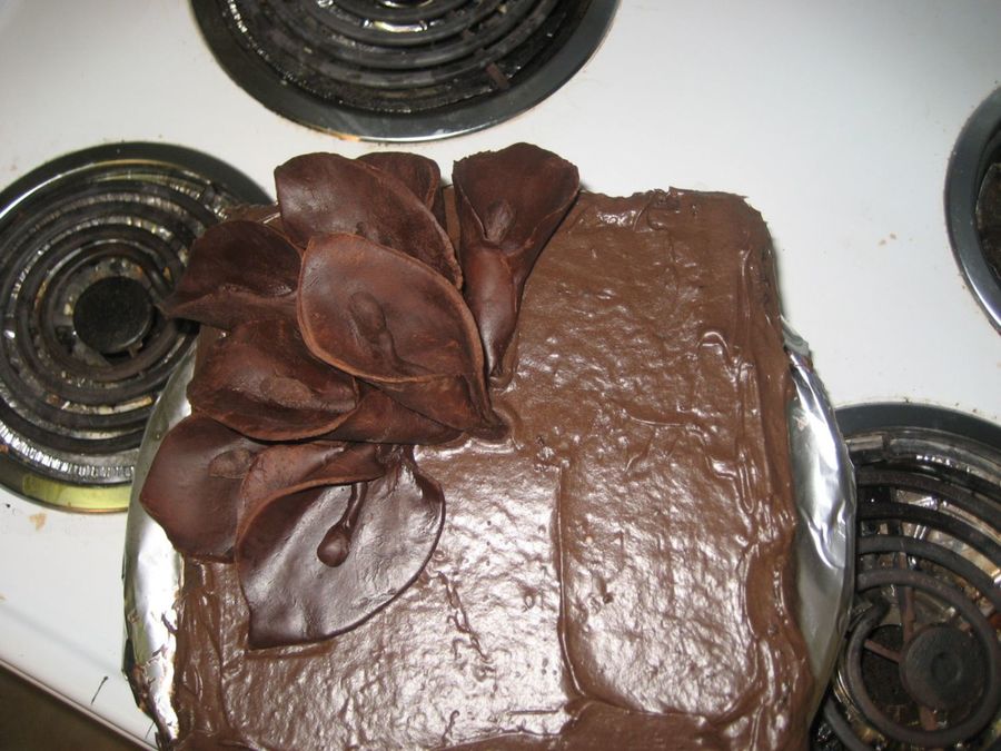Chocolate cake, with a homemade recipe for chocolate frosting & chocolate clay lilies