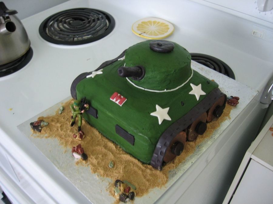 army tank cake - buttercream with fondant decorations, wagon wheels and mini oreos for the wheels. thanks for the inspiration from all the other tank cakes!!