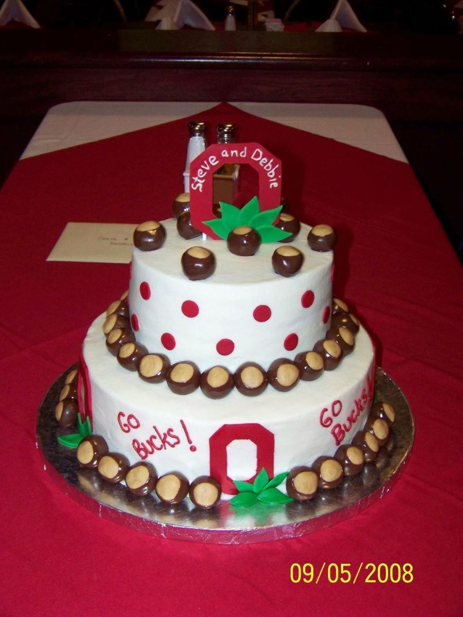 This was a wedding cake for a osu themed reception. 12 inch and 8 inch iced in buttercream with fondant decorations the borders are candy buckeyes.
