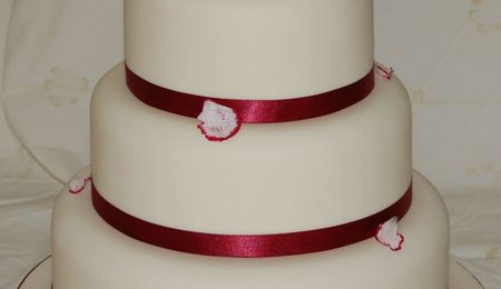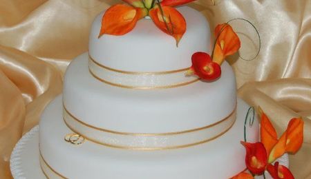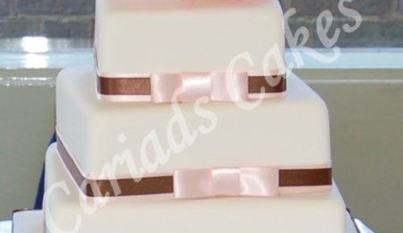 Square cakes sizes 6" + 8" + 10" placed at different anglles on each tier. Hand made Callas.