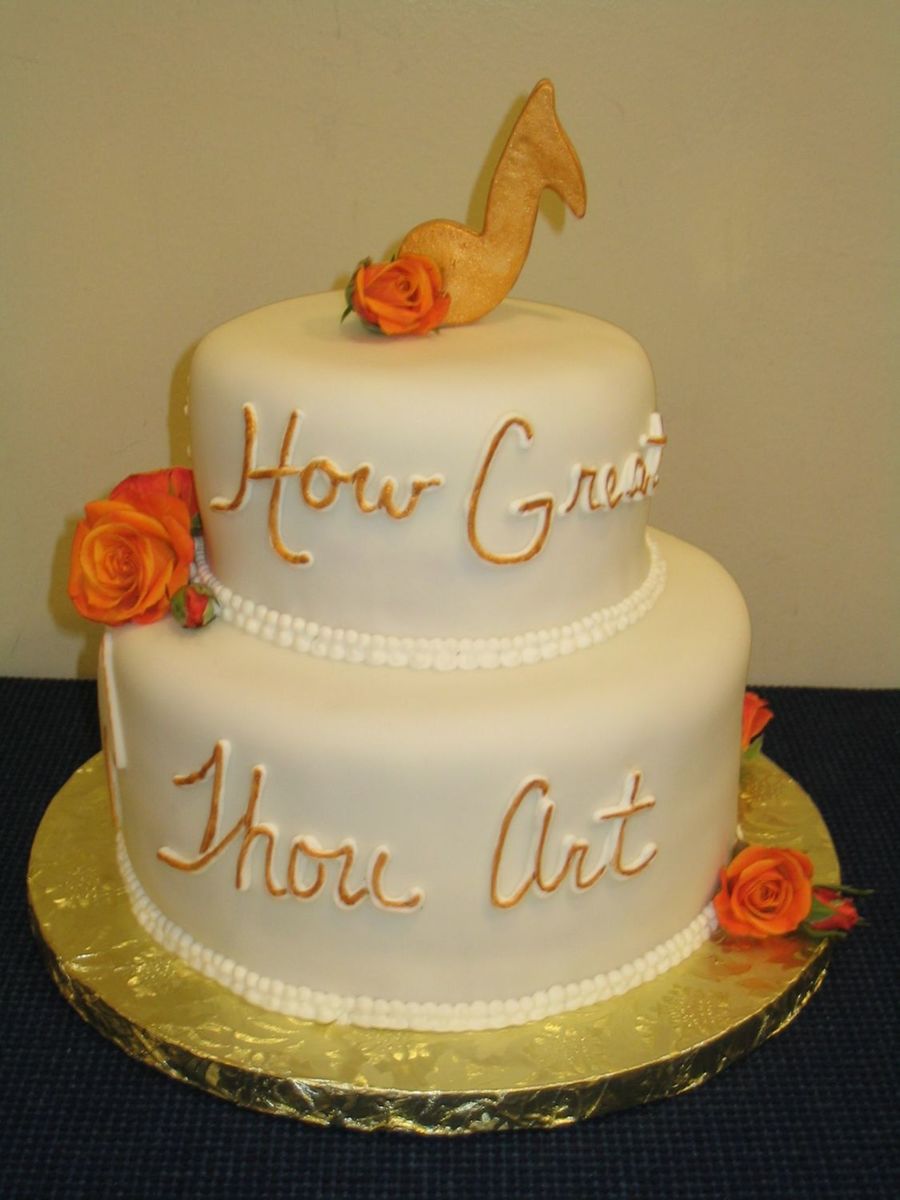 My church has a Songwriters Showcase once a year and I felt this was appropriate. Covered in fondant with fondant and royal icing accents, painted in gold luster dust.