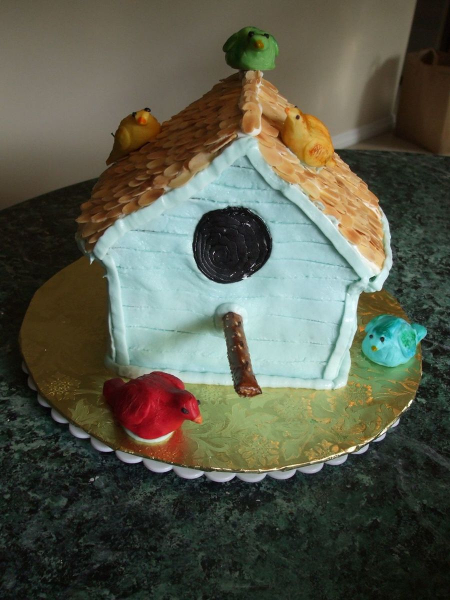 Birdhouse cake done in buttercream, almond shingles, birds in candy clay. Would do siding differently next time, but was in a rush for Mother-in-law's birthday.
