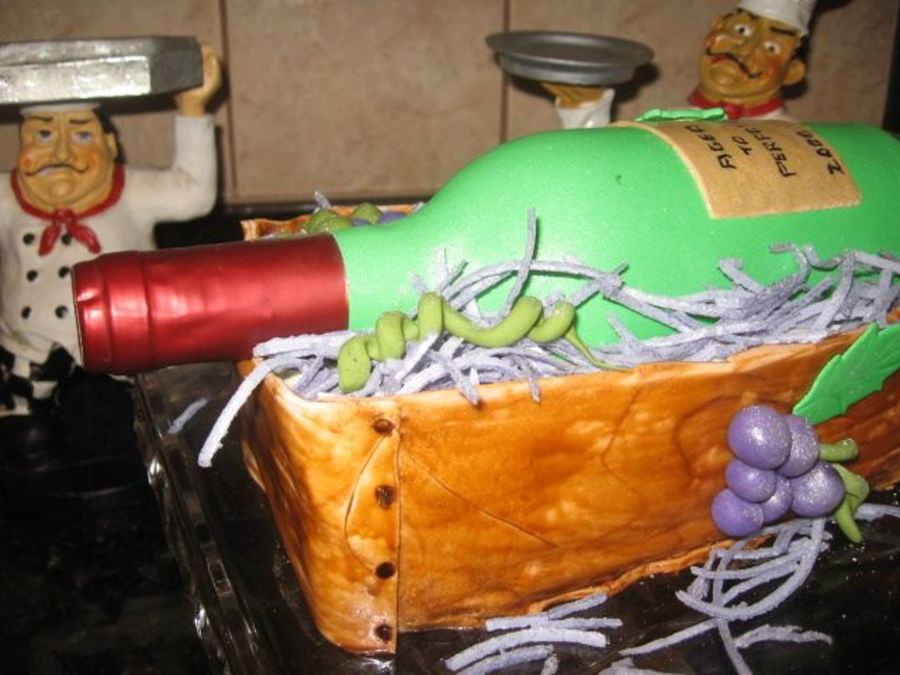 This was my first attempt at a bottle, and the wood look. lemon cake with creamcheese filling, fondant sides and grapes and the bottle is made out of Gp. There are a few things I would like to improve,but never the less I had fun doing it.