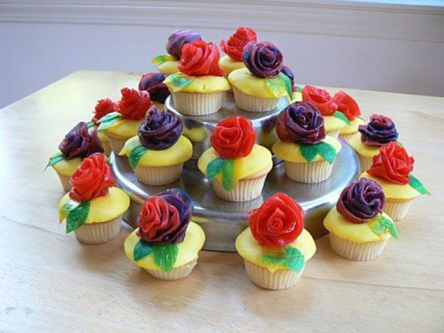 I made these cupcakes for my daughters class for her 5th birthday. These are mini cupcakes decorated with roses and leaves made of fruit rollups.