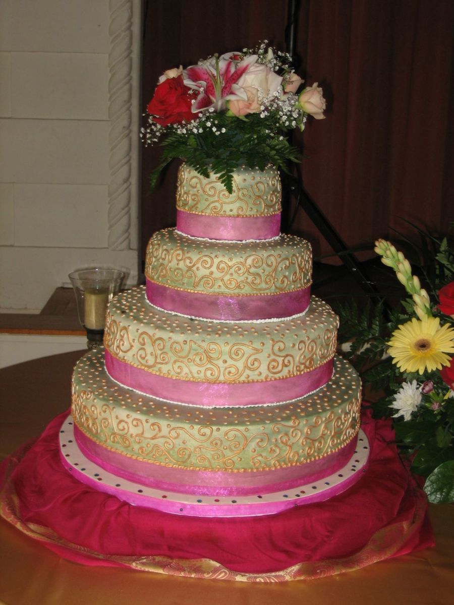 Round 6", 10", 14" and 18" chocolate candy bar cake covered in fondant. This cake is for a really good old friend of mine for his wedding, his wife is from Nepal so I was inspired by her sari and her invitations. The color of fondant was hand painted with luster dust, scroll work from the bride's sari and hand painted gold to match. Paink ribbon to match the color of the sari and flowers were taken f rom the invitations. Base is made from wood and covered with indian inspired pattern on the edge. Enjoy!!!