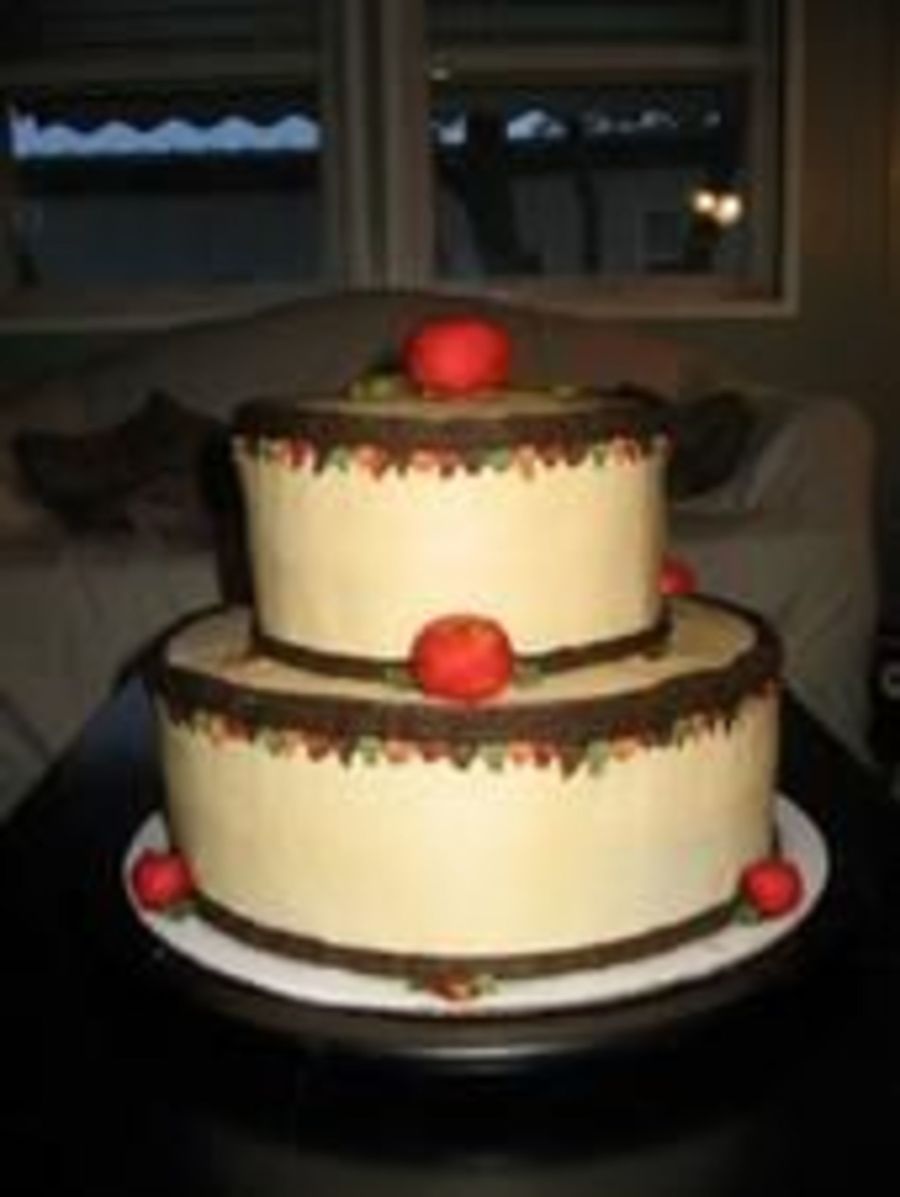 Border is made of mulitcolor ri leaves. Apples are marzipan.