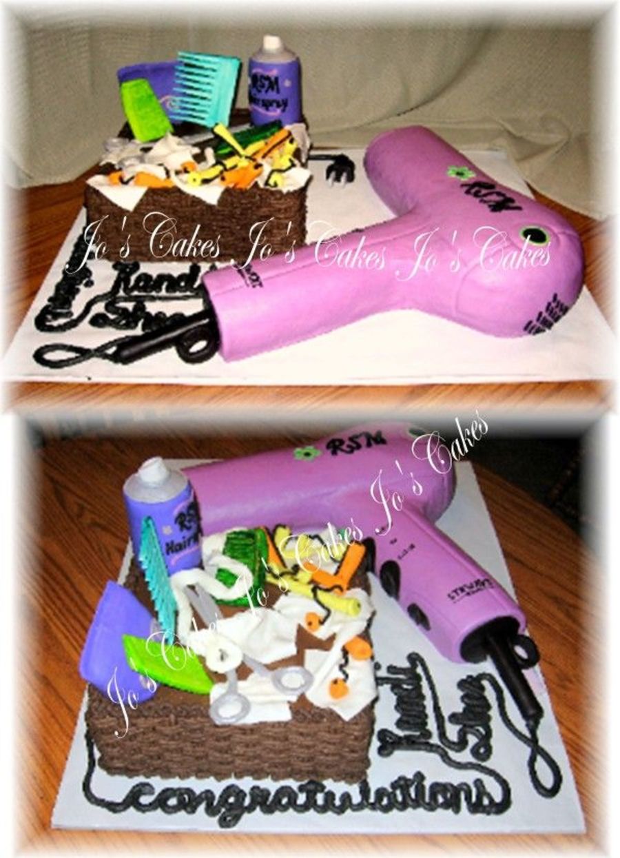 Buttercream cakes - 10" 2-layer chocolate basket, 2 - 8" rounds plus 9x13" white carved blow dryer. MMF and RK treat products, accents, etc. Made for a girl graduating from beauty school.