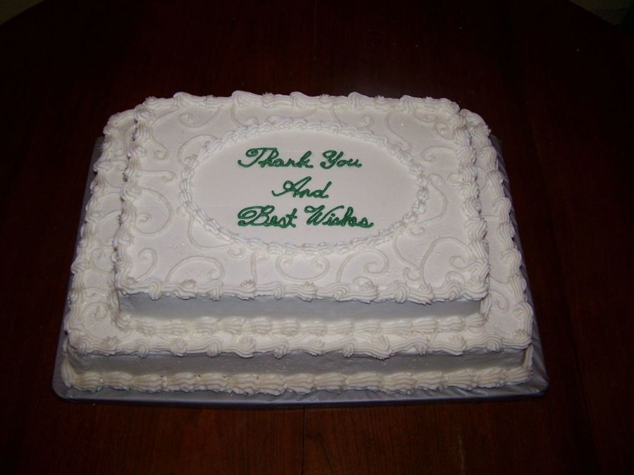 This cake was made for our preschool director who was retiring and then moving away. Bottom layer is chocolate cake; top layer is white cake. Both layers have buttercream.