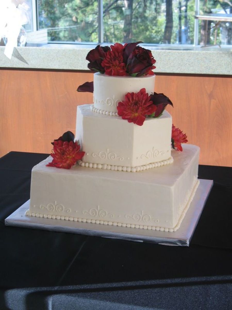 My last "official" cake this year aside from my cousin next weekend. I had more things go wrong with this one than I've ever had, all throughout production, but it still turned out fine and no one knew it was a nightmare to put together. She loved it, and I got to chat with the bride for a bit when I set up, which I don't usually get to do, so that was nice. 6, 10, and 14 mixed shapes, chocolate with cheesecake flavor filling, vanilla caramel, and white with raspberry.