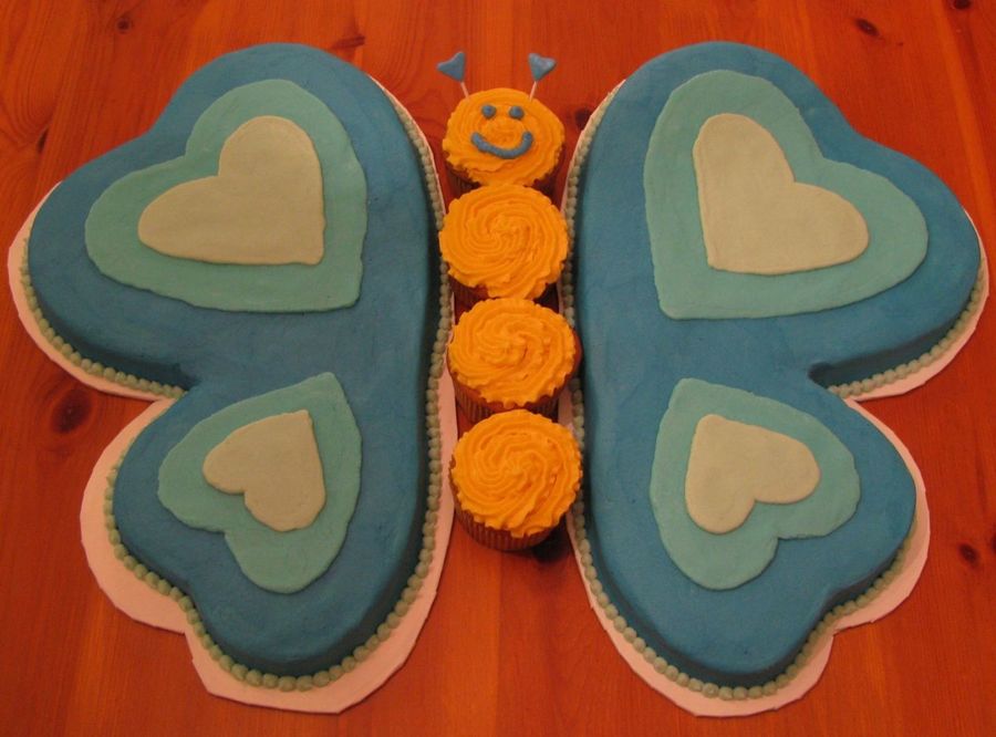 Blue butterfly for a 9 yr old girl's bday. I baked a 6 inch and 9 inch heart for the wings. Body is 4 cupcakes. This one was super fun and a big contestant for my cutest cake ever.