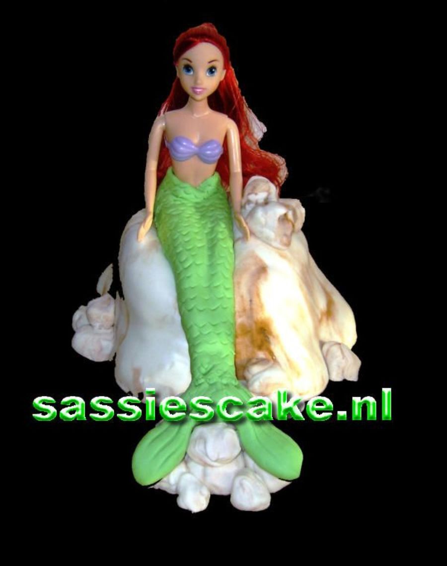 A Disney kind of cake, Ariel the mermaid. Made of a Barbie doll, covered with fondant (sugarpaste) filled with chocolate mousse. The rock was the actual cake....