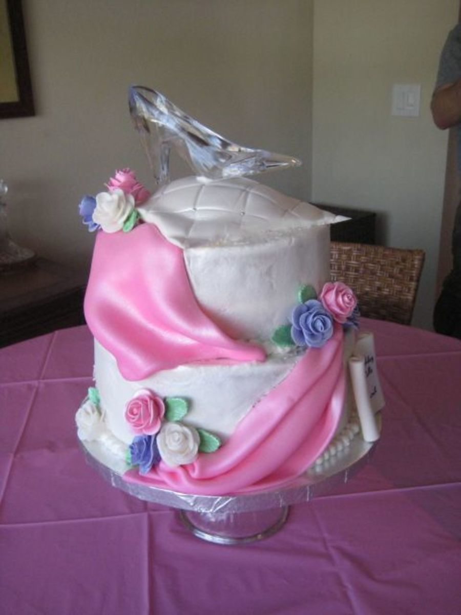 A friend of mine ordered this cake for her daughter turning 3. One night, while reading "Cinderella's Fairytale Wedding Story" to her daughter, she comes across Cinderella's wedding cake. Her daughter jumped up and said, "Mom, that's the cake I want for my b-day!" So, my friend called me up and asked me to mimic it as much as possible. This is my interpretation of it. The cake is vanilla with strawberry cheesecake filling. It's all buttercream with the exception of the swags/draping, flowers,& pillow.