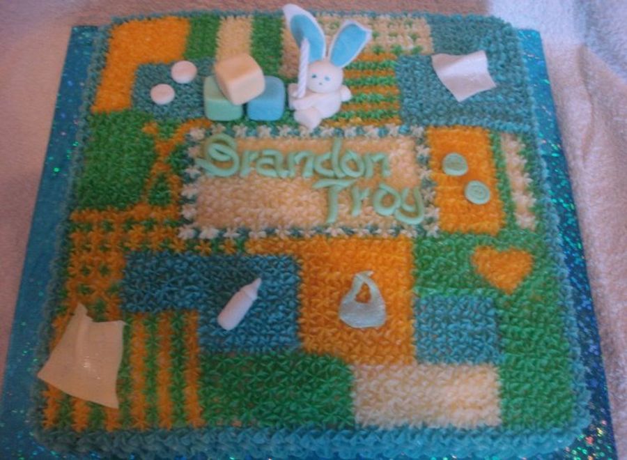 12x12 in. cake made for a littleboy's first month birthday,baby shower.sponge cake with strawberry buttercream filling and covered with all buttercream patchworks-my first attempt. it's quite straight forward and fun. tfl. and thanks CC!