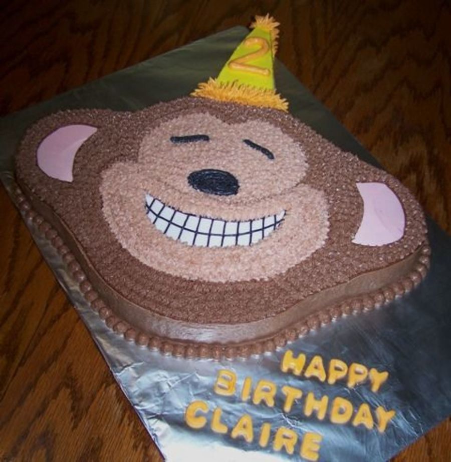 I made this monkey cake using a 10-inch round and an 8-inch oval, the 10-inch was used for the face, I then cut the oval into thirds. I used the 2 end pieces for ears and the middle piece was cut into a triangle for the party hat. The monkey is iced in BC and I used MMF for the birthday message.