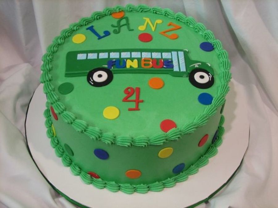 This was done for a fun bus party (a fun bus is a bus that is full of gym equipment that comes to your party location). The cake is done in buttercream with fondant accents.