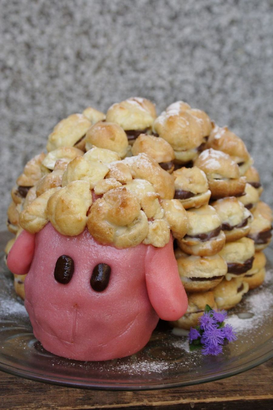 Cake I made for my brother's birthday. Mini cream puffs around, face covered in turkish delight fondant.
