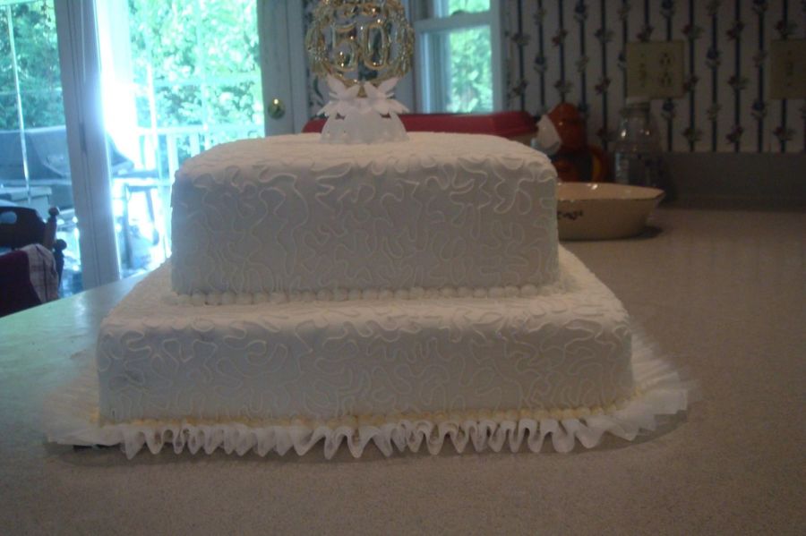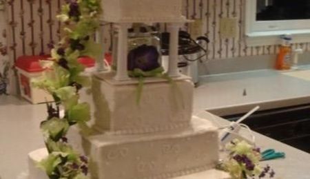 This is just a plain and simple anniversary cake. The cake is white with lemon curd in the middle to keep the gold theme going. If I could do this cake over again I definately would not put the gold glitter around the bottom it just took away from the cake. The lady who ordered the cake loved the dots/balls around the bottom because she thought that they looked like pearls.