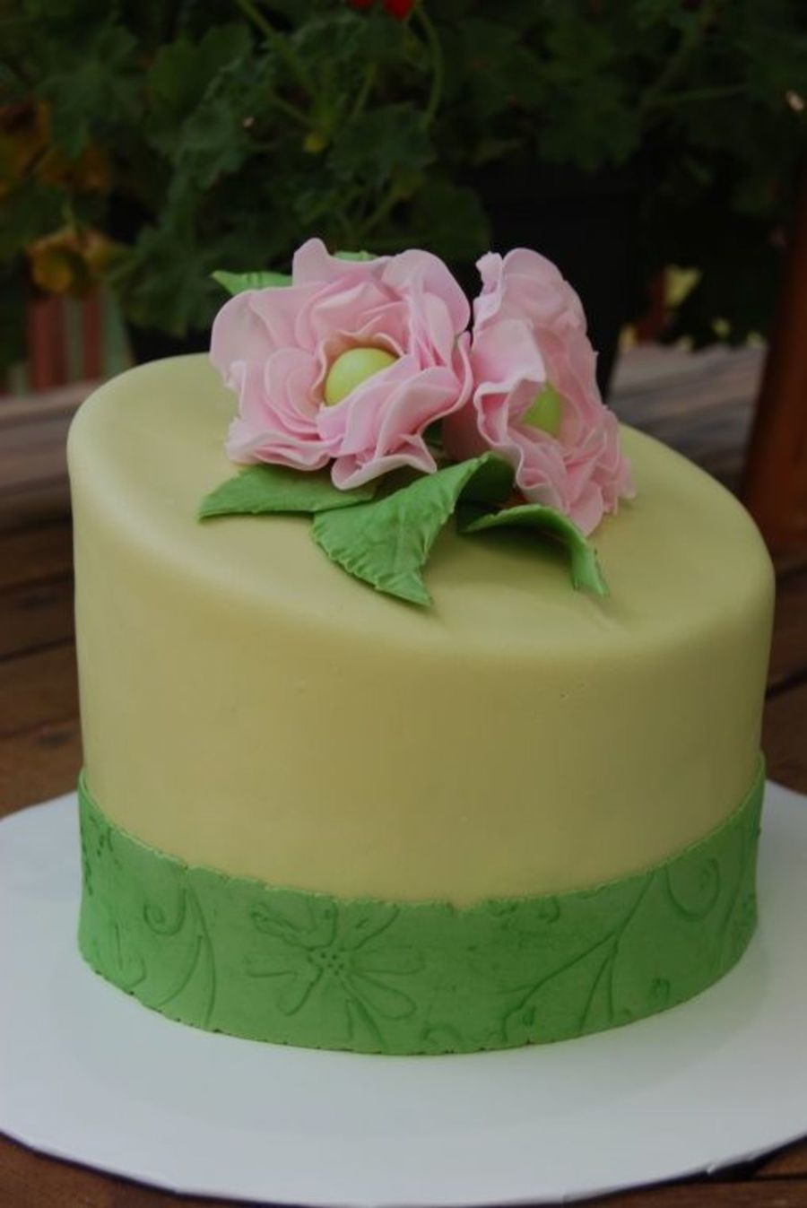 6" cake made for birthday gift. chocolate cake iced in smbc and covered in fondant. gumpaste flowers. band impressed and dusted with petal dust.