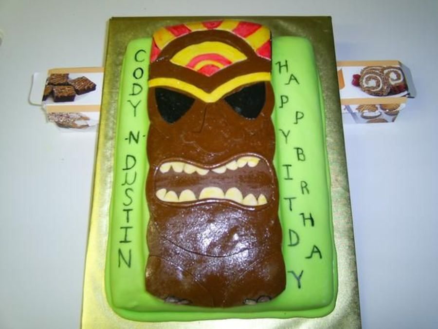 Here is a Tiki God cake made for a tiki them childrens party. It is chocolate cake covered in tinted fondant. I used the wilton due to it being last minute request.
