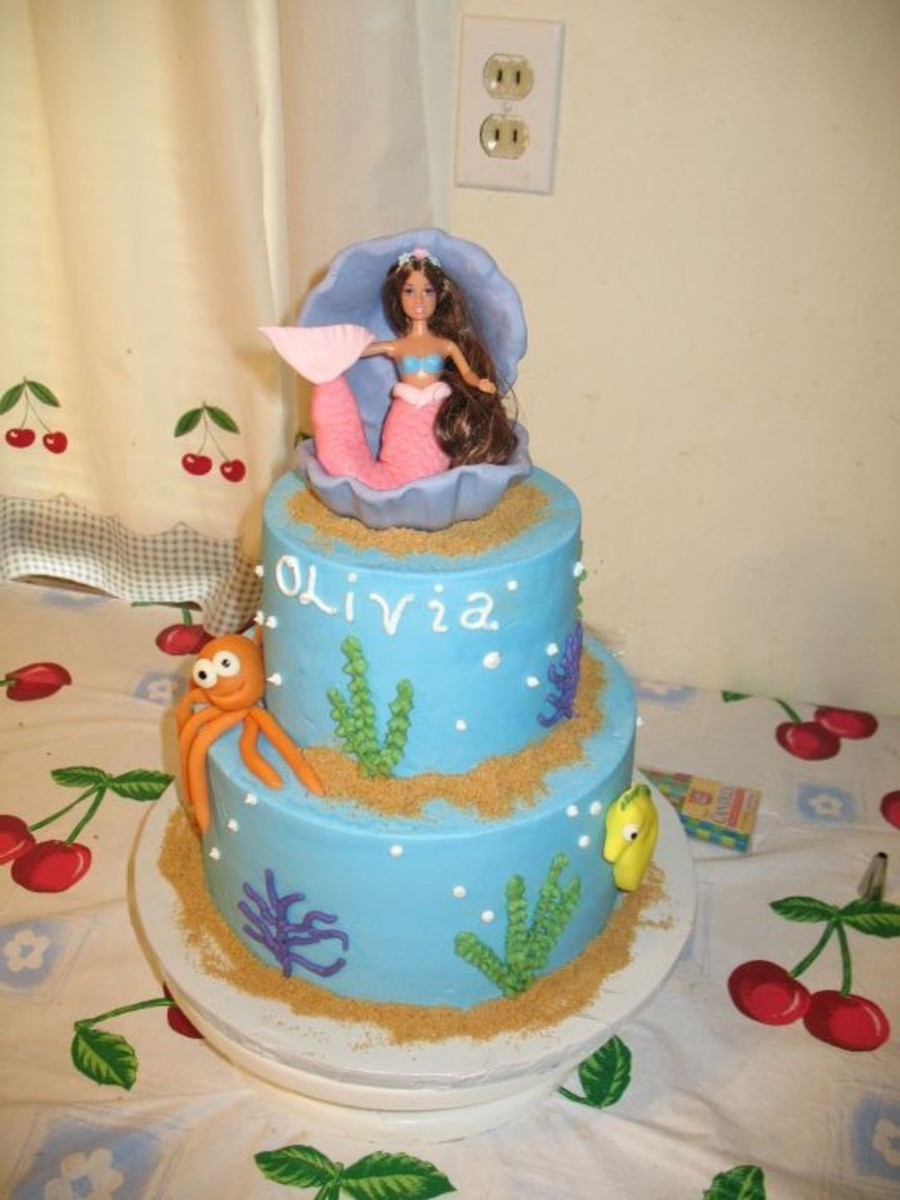 The woman how ordered this wanted a mermaid cake, but not Little Mermaid. All accents are MMF except the doll. The tail and shell are MMF.