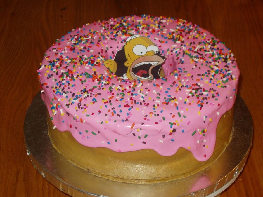 Simpsons Donut cake I made for my kids who love Homer. Thanks to everyone who has one of these in the gallery, they were all inspiring. This is two 9 inch rounds. I cut a hole out of the center. The pink is royal icing.