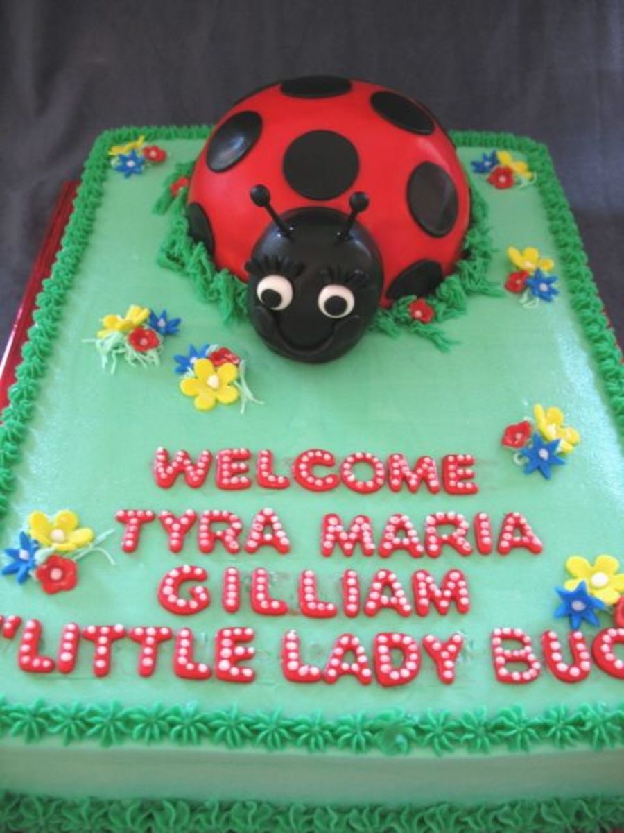 Idea thanks to Wilton. Yellow cake covered in buttercream. Lady bug, letters and flowers all out of fondant. Really fun to make. A real hit at the welcome baby party.