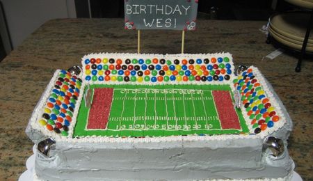Chocolate cake with vanilla buttercream. 9" x 13" on bottom for "grass." The tractor is carved out of a loaf pan. Gumpaste wheels, steering wheel and exhaust pipe.