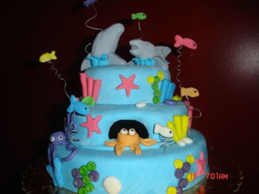 Another one of mine and my husband's creations. We got our idea from this wonderful site and added our own twist to it! Chocolate cake with whipped cream, chocolate pudding and Heath candy bits for the filling. Covered with chocolate BC and MMF.