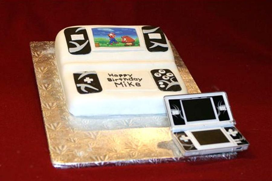 I made this cake for my son's birthday. He wanted a plan white cake with something to do with his Nintendo DS....I hope he likes this :-) Covered in fondant, picture is laminated since I couldn't do a "trademark character" on edible paper.